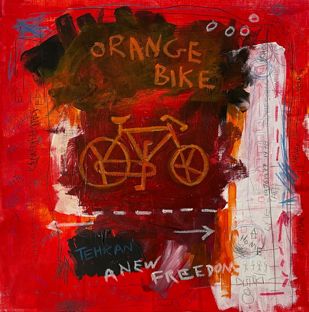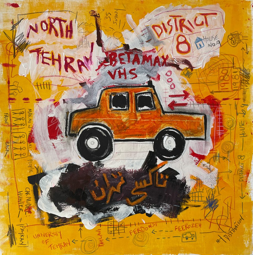 Tehran – 2021’s Collections – Tehran, The City of Orange Taxis – Acrylic, Oil Pastel and Colour Pencils on Acrylic Paper 40cm x 40cm