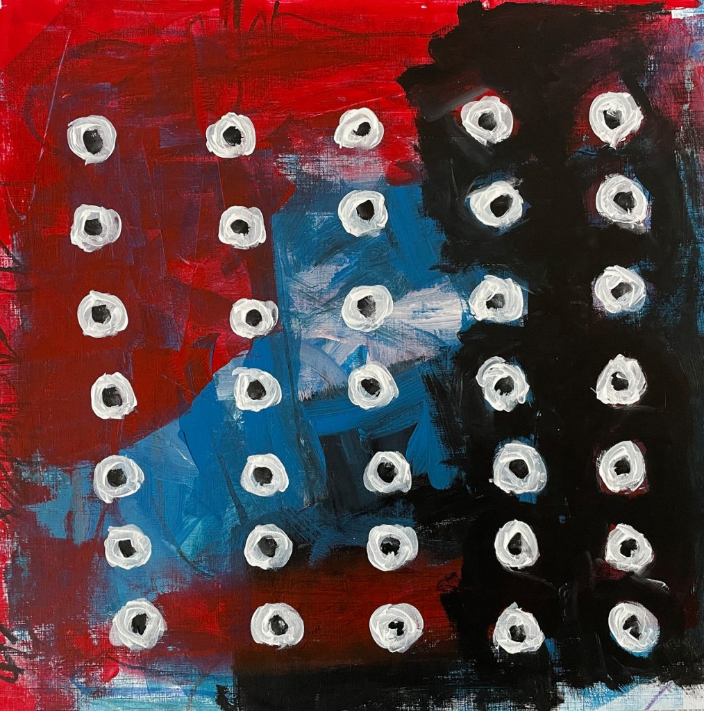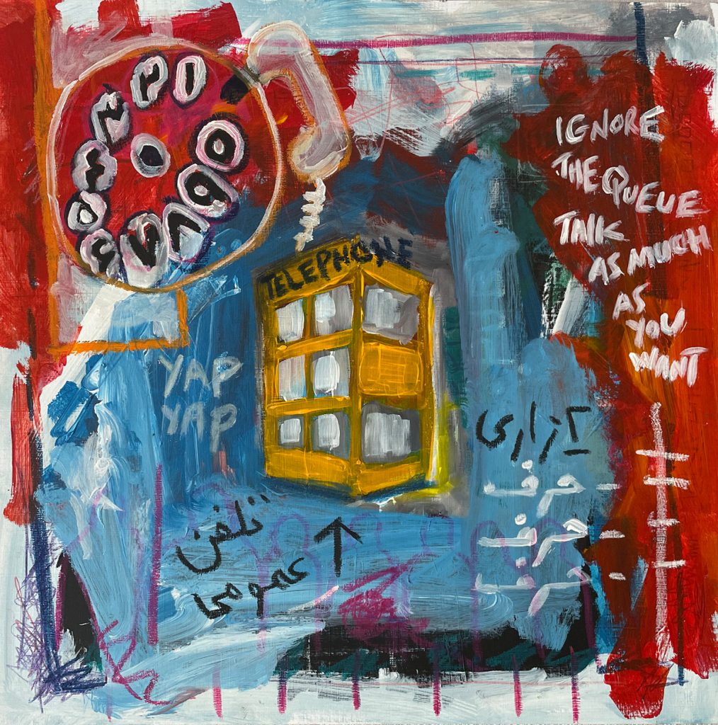 Each of these striking 18 multimedia pieces, invigorated with acrylic paint, oil pastels and coloured pencils – defies its physically diminutive scale – standing at just 40cm x 40cm. Bursting from their seams to assail the viewer with a volley of contrasting colours – these abstract studies demonstrate how deeply felt emotions cannot hope to be suppressed. Instead, these voices only become more volatile and urgent when they are hemmed into a strictly regulated communicative arena.